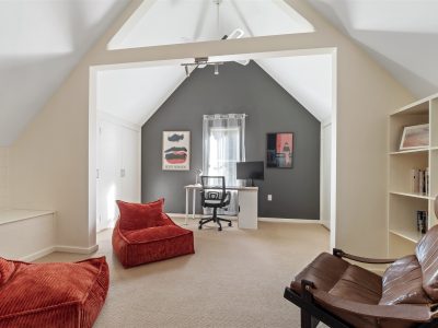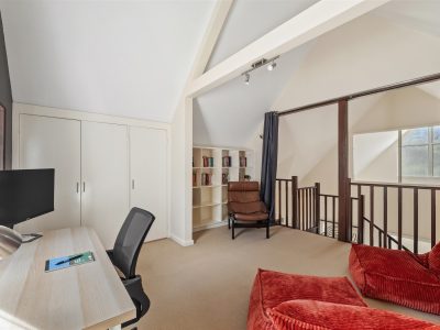 On the opposite side of the home are two additional bedrooms, one with a queen bed and the other with two single beds, along with the main bathroom featuring a shower and a separate toilet for added convenience. Upstairs, a versatile playroom offers additional space to relax, read or work, doubling as a library or home office.