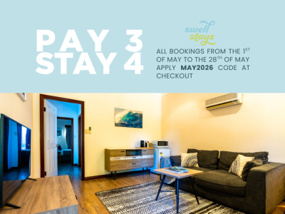 Margs Break is a compact studio apartment with all you need for a quick getaway in a central location in Margaret River town. As you walk up the stairs to the first floor, you enter the front door on the west end apartment and are welcomed into the living room. The living room has a TV, comfy couch, table and chairs. There is no kitchen, however the following are provided as tea & coffee making facilities; coffee machine (pod), kettle, toaster, microwave, bar fridge, basic cutlery and crockery.