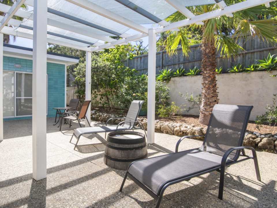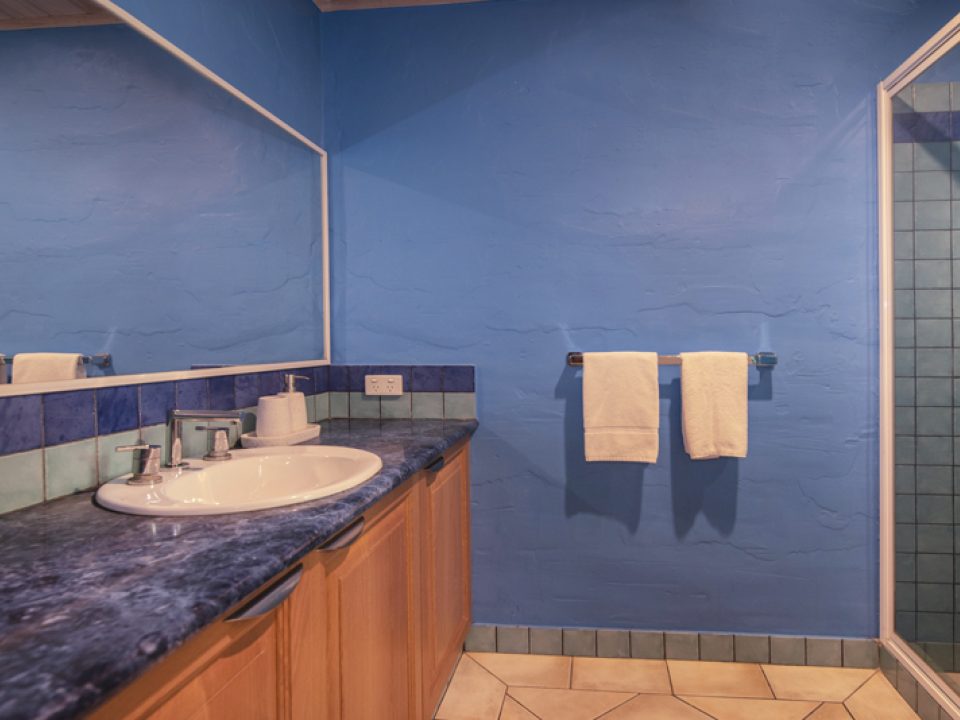 Off the kitchen is the second sitting area, here you’ll find the wood fire and this open plan living area opens onto the outdoor courtyard. The second, third & fourth bedrooms are up the steps and open off the activity area. The second and third bedrooms each have a queen bed and the fourth has 2 single beds.